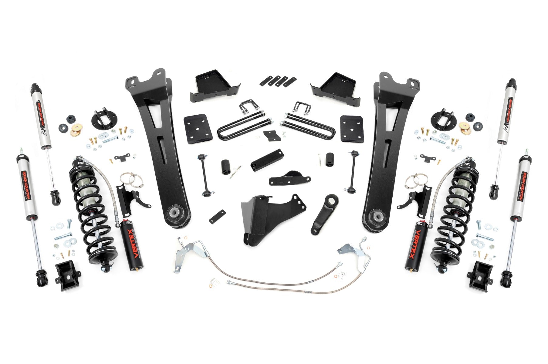 Superior Ride Quality. Take your second-generation Ford Super Duty to new heights with Rough Country's 6-inch Radius Arm Coilover Conversion Suspension Lift! This all-inclusive kit comes with everything you need for a total transformation of your truck. Run up to 37in tires while preserving the smooth, factory ride quality with this impressive upgrade.\ Durable Components. When changing a vehicle's suspension, the key to preserving ride quality is keeping the geometry of all suspension components as close to their factory angles as possible. Rough Country's new 6-inch Radius Arm Suspension Lift features a set of ultra-durable Radius Arms, precision fit to bolt right into the factory mounts for an easier install and a more factory-like angle. At 27lbs each, these beefy, upgraded Radius Arms dwarf stock equipment and feature durable durable rubber bushings for maximum vibration absorption. Rough CountryΓÇÖs 6" Radius Coilover Conversion Lift Kit features top-mounted reservoir brackets and coil-over mounts constructed from 1/4-inch steel. Utilizing this conversion kit you're removing the factory independent coil shock and coil set-up and replacing it with a massive 2.5in piston, nitrogen-charged, 8-stage adjustable Vertex Coilover. Rough CountryΓÇÖs Vertex Coilovers feature a monotube design with an external reservoir for increased oil capacity and damping sensitivity. When it comes to investing in a high-end kit, youΓÇÖll be pleased to find that Rough CountryΓÇÖs 2.5in piston design is beefier and offers an impressive 56% greater fluid capacity than the average reservoir shock. Each kit is paired with a monotube shock that provides optimal damping control.\ Installation. Requiring cutting and drilling to install, an estimated timeframe of 6-10 hours is recommended to complete this full installation. This full kit can be installed at home and can be completed efficiently and quickly!\ Limited Lifetime Replacement Warranty. Rough Country's 6-inch Radius Arm Coilover Conversion Suspension Lift Kit is backed with a limited lifetime replacement warranty towards manufacturer defects. As such, the product is protected from structural and workmanship damage after the date of purchase. With our industry-leading warranty give yourself peace of mind when using Rough Country's Suspension products!