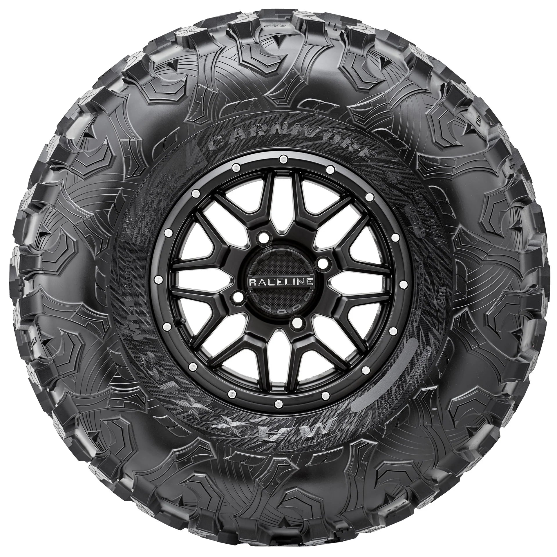 A true light truck inspired tire, engineered for performance in extreme (west coast) terrain. 8-Ply radial carcass and a tread design that allows for ultimate control on and off-road, the Carnivore has the superb tread wear you expect from a Maxxis tire. This tire also features a specialized rubber compound for excellent traction on rocks, roots and desert terrain. Eight-ply radial construction lets the Carnivore withstand the heavier loads and high speeds of your largest SxS machines.