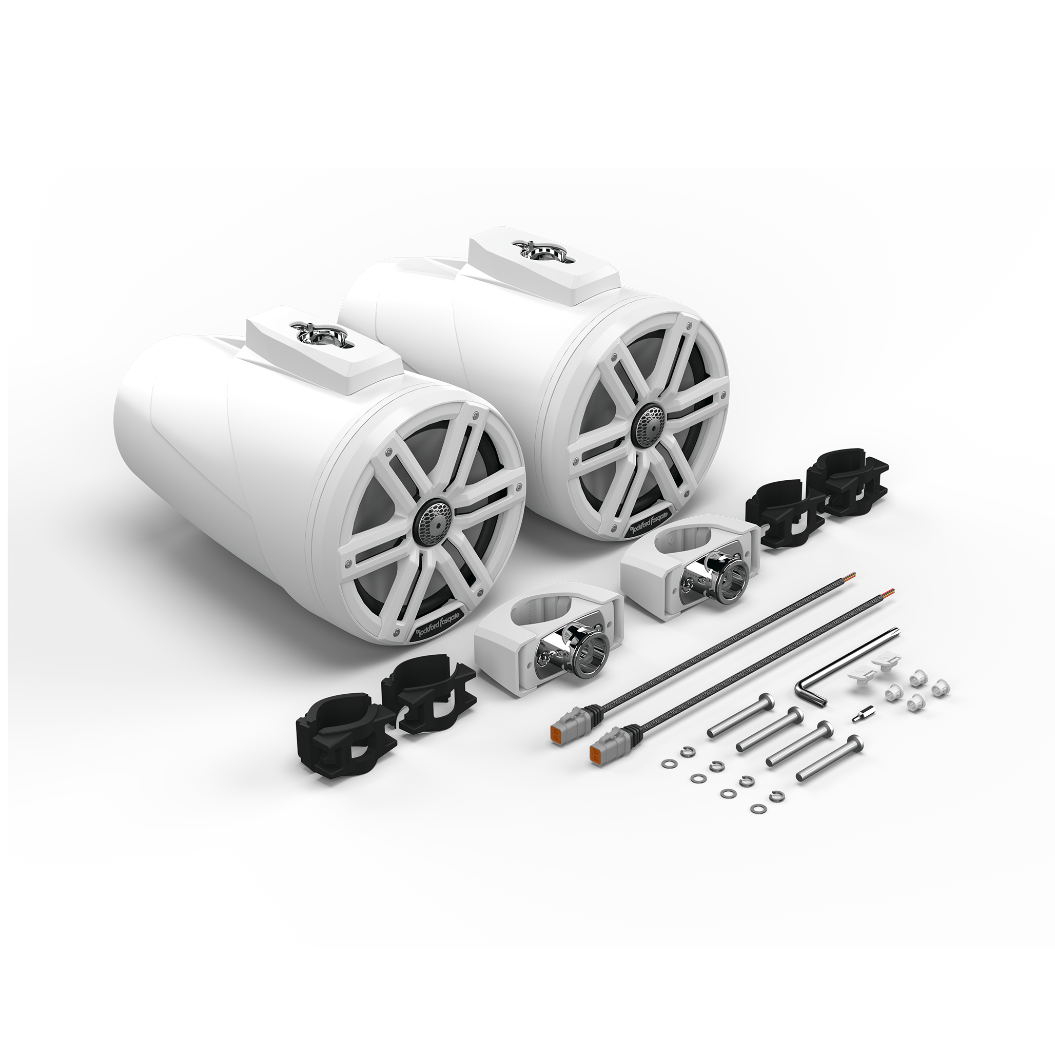 | In The Box | (2) Loaded wake cans (2) Universal clamps (replacement 1130-74671-B1) (4) Grommets (2) Spare safety inserts for screw clamp (1) Safety Torx wrench (2) 1.5" to 2.5" rubber inserts and stainless screws (2) 2.5" to 3" rubber inserts and stainless screws (2) Stainless steel grilles (2) Sport grilles (1) Allen bit for rotating speakers (2) 6-pin Deutsch™ harness (1130-73416-C1) |