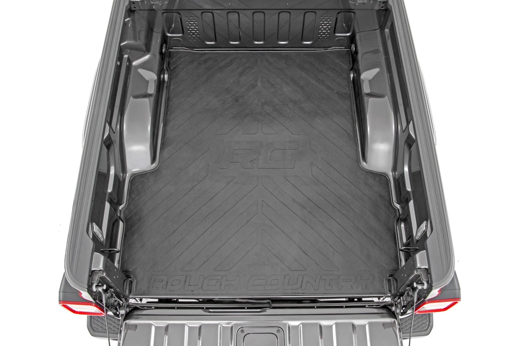 Innovative Design and Material. Keep your bed free from scuffs, scrapes, and scratches with Rough Country Bed Mats. These heavy-duty, 3/8-inch thick, contoured rubber mats are nearly indestructible; made from a high-quality rubber compound that won't crack in extreme temperatures or fade when exposed to the sun. This stylized bed mat features a large "RC" and "Rough Country" logo with angled lines for an improved look that also protects your truck bed.