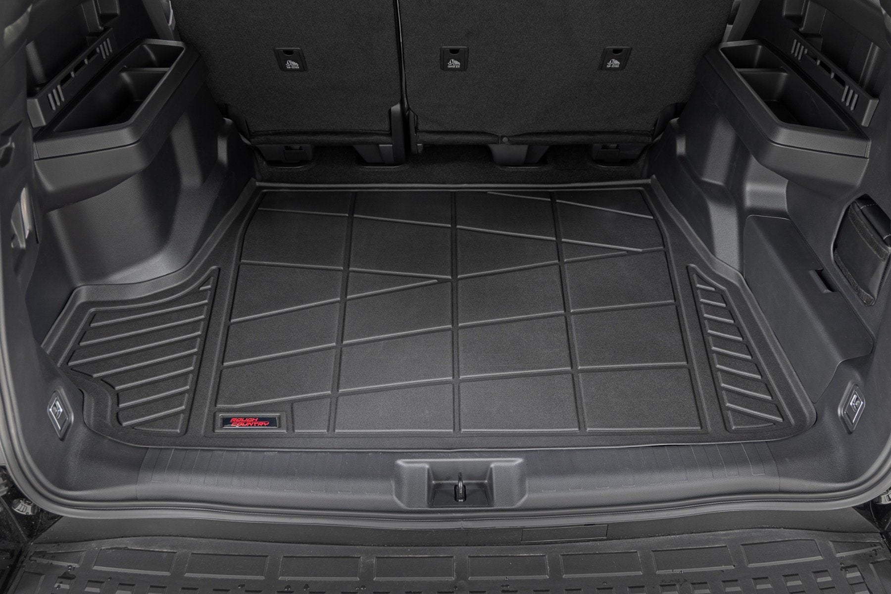 Keeping your ride spotless isn't always easy, especially with the unpredictable weather and accidental spills. Now you can ditch the dirt and keep your ride clean with Rough Country's Sure-Fit Cargo Mats! All-Weather Protection: Our Sure-Fit Cargo Mats are built to conquer any mess, from snow and mud to sand, salt water, and even that mystery puddle you're too afraid to touch. Spilled coffee? Don't sweat it! These mats feature a raised lip design that traps spills before they can reach your carpet. Plus, the textured surface keeps your feet firmly planted (no matter how messy things get). Sure-Fit Design: Made from tough Thermoplastic Rubber, these mats can handle anything you throw at them. They're flexible enough to contour perfectly to your 4Runner's floor, but strong enough to withstand even the most extreme temperatures. And the best part? They're custom-designed for your ride, so you get a perfect fit with extra coverage, whether you're rocking bucket or bench seats. Installation is a Breeze: Simply swap out your old mats and put ours in place. And they're just as easy to remove for cleaning, whether you're hitting them with the hose or giving them a quick vacuum. Made with pride in the USA using high-quality materials, they're built to withstand the test of time. And to show we stand behind our product, we offer a Limited Lifetime Warranty, so you can drive with confidence knowing your investment is protected. With Rough Country's Sure Fit Cargo Mats you get the perfect combination of style, durability, and peace of mind, knowing your vehicle's floors are protected no matter where the road takes you. Life is messy, but your truck doesn't have to be.